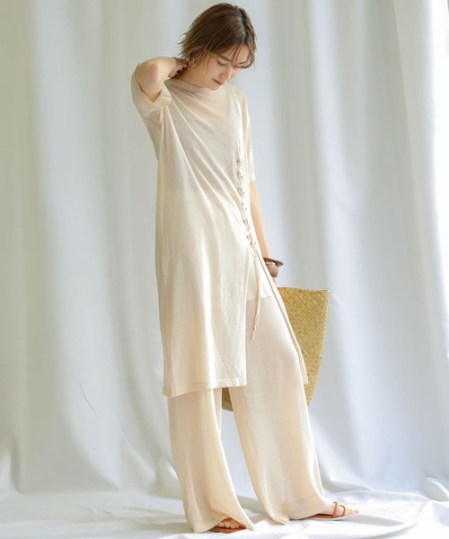 編み上げニットセットアップ 透け感コットンリネンゆったりシルエット半袖ロング丈トップス ボトムスシアーセットアップ つなぎ オールインワン Moca セレクトモカ のファッション Select